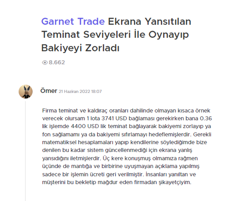 Garnet Fx şikayetler başlığı altında kullanıcıların kurumda sorun yaşadığı ortak noktalar ve Garnet Fx ile ilgili yorumları ele alacağız. Ayrıca kurumun bu şikayetler karşısında nasıl bir tutum ve çözüm yolu izlediğini de inceleyeceğiz. Garnet Trade , nispeten yeni bir kurum olmasına rağmen şimdiden önemli sayıda şikâyet biriktirmiştir. Şikayetler ağırlıklı olarak, potansiyel yatırımcıların istenmeyen ve sık telefon aramaları ve taciz edilmesi, kurum tarafından sağlanan spread oranlarında danışmanlarının yatırımlarını ve karlarını olumsuz etkileyen hızlı ve haksız ayarlamalar gibi konular etrafında dönmektedir. Ayrıca şirketin yatırım danışmanları tarafından başarılı işlemlere müdahale edildiği ve engellendiği iddiaları da bulunmaktadır. Tüm bu eylemler, şirketin müşterileriyle olan ilişkilerinde adalet ve şeffaflık eksikliğini gösterir ve onu güvenilmez bir kurum haline getirir.
