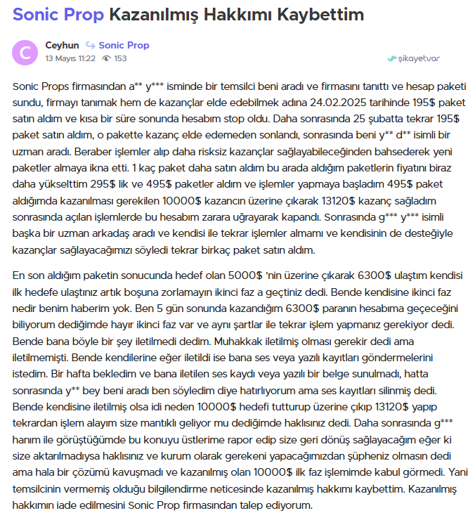 Sonic Prop şikayetler neler? sorusunun cevabı ne yazık ki oldukça çarpıcı: yatırımcılar destek alamamaktan, yanlış yönlendirildiklerinden ve işlem sonrasında tamamen yalnız bırakıldıklarından şikayet ediyor. Bu tür yorumlar bireysel vakalar değil; tekrar eden, kalıcı bir problem yapısının sonucu.